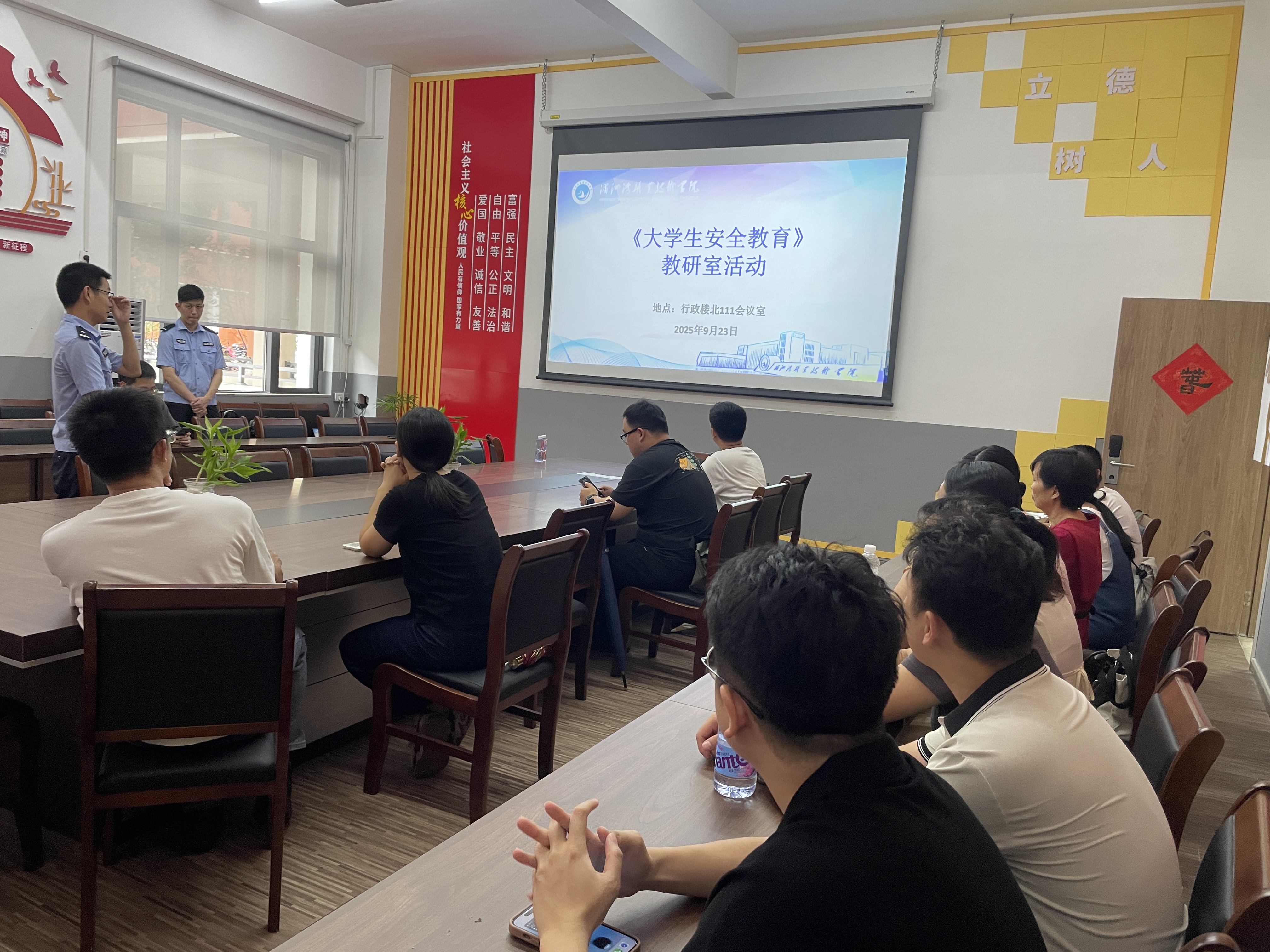 9月23日下午,大学生安全教育教研室在行政楼北111会议室开展专题教研活动,特邀莆田市公安局荔城分局反诈中心副指导员王志铭警官进校指导,围绕线下8课时反诈内容的备课工作展开深入交流,为提升大学生反诈教学质量注入专业力量。